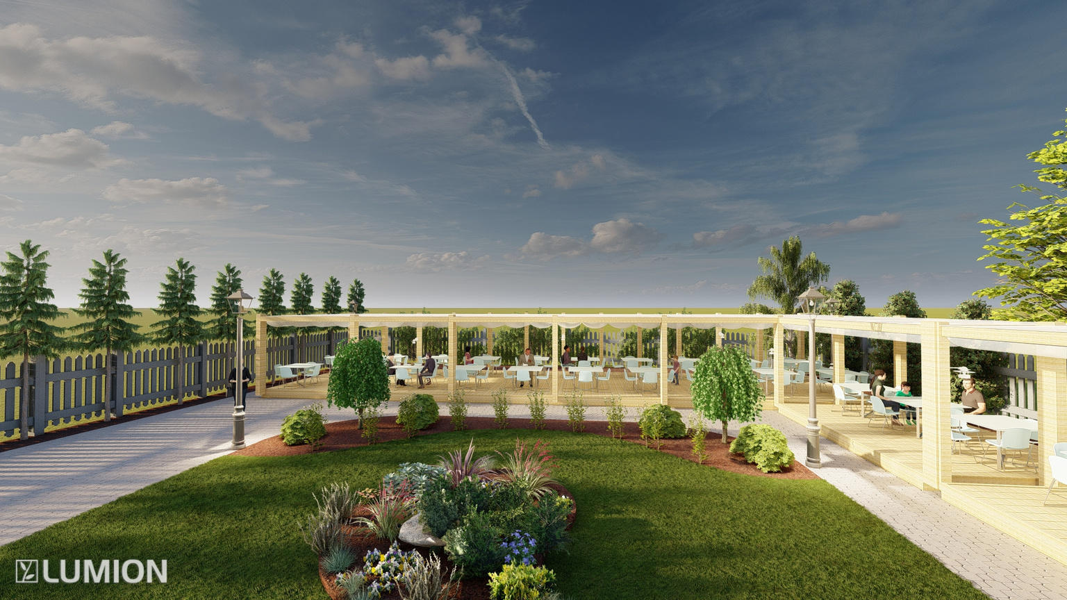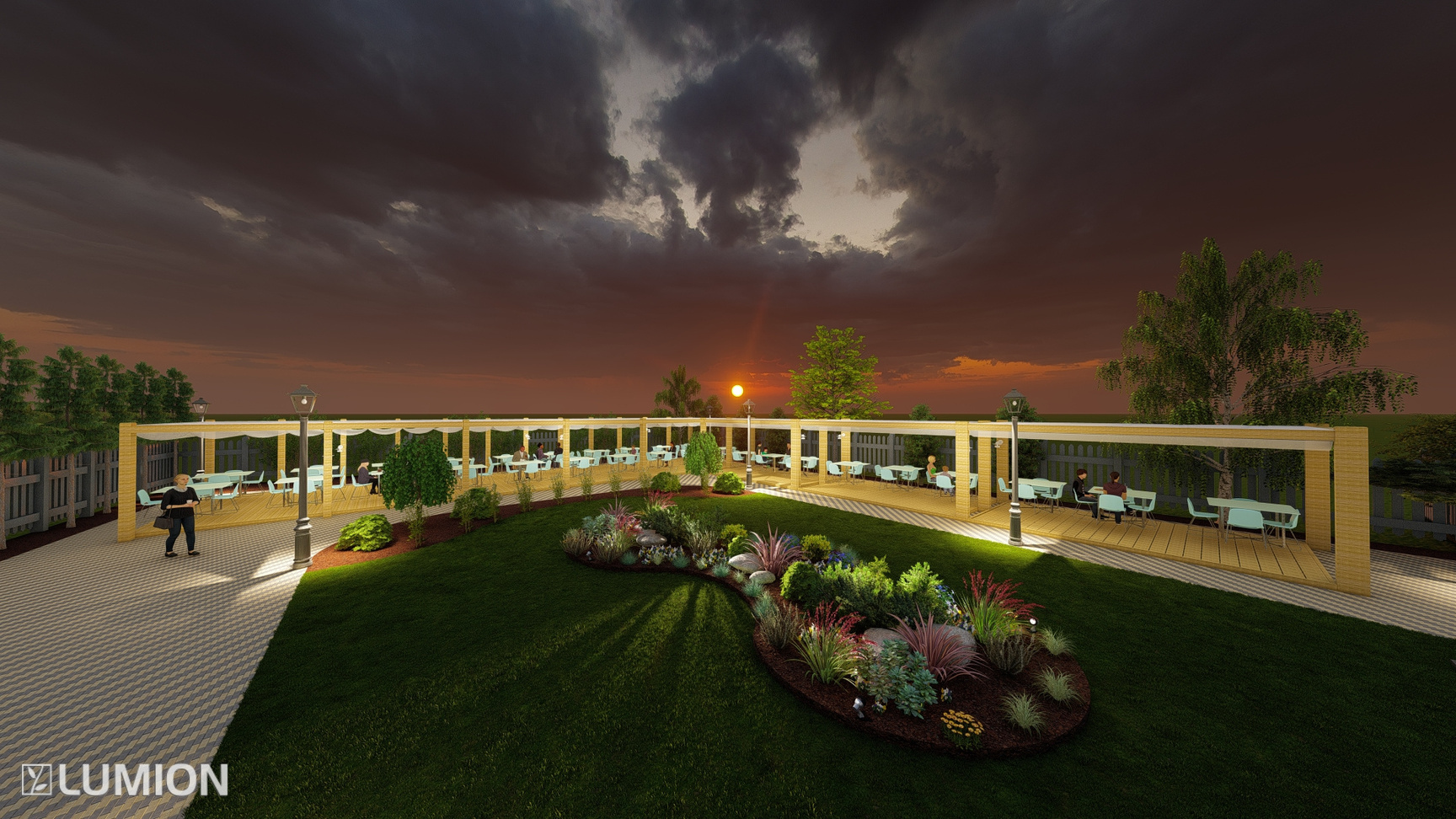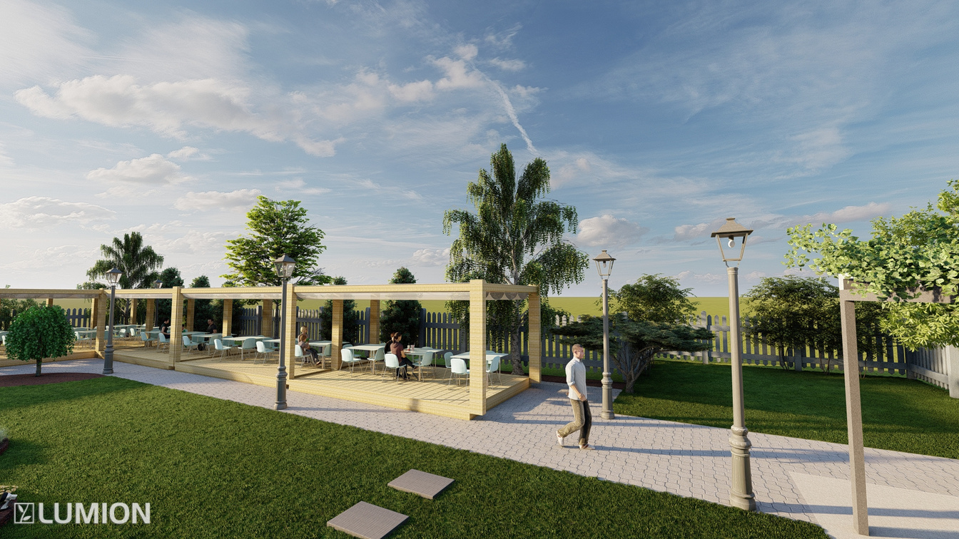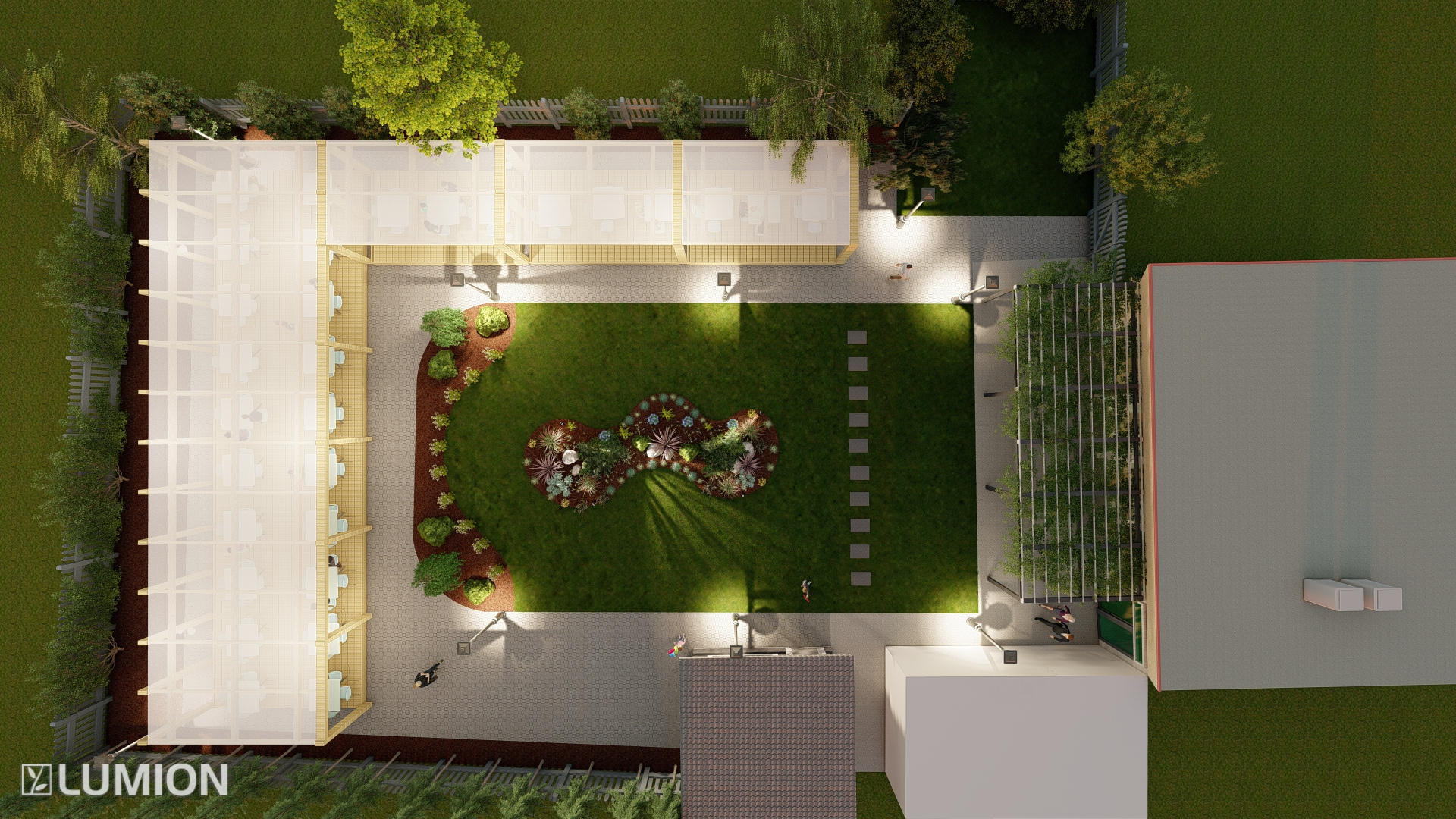 Restoran bahçesinde yer alan yeme içme alanları, tente sistemi ile gölgelikli alanlar oluşturularak müşterinin konforu gözetilmiştir. Konforun yanı sıra ahşap dokulu malzeme seçimi yapılarak sürdürülebilir ve estetik bir mekan oluşturulmuştur. Alan, bitkisel elemanlar ile kompozisyon oluşturularak doğal bir mekan tasarımı ile zenginleştirilmiştir.