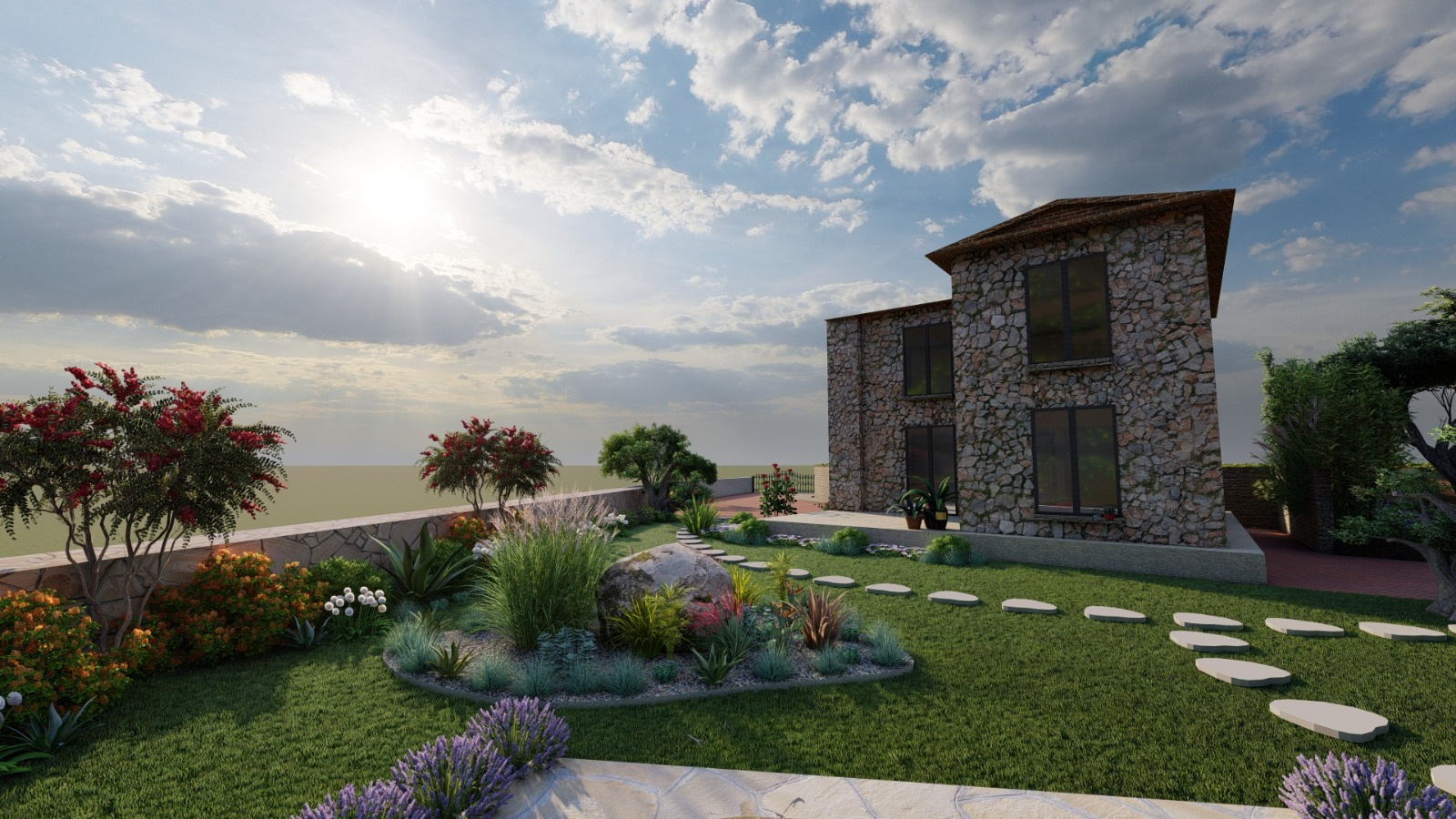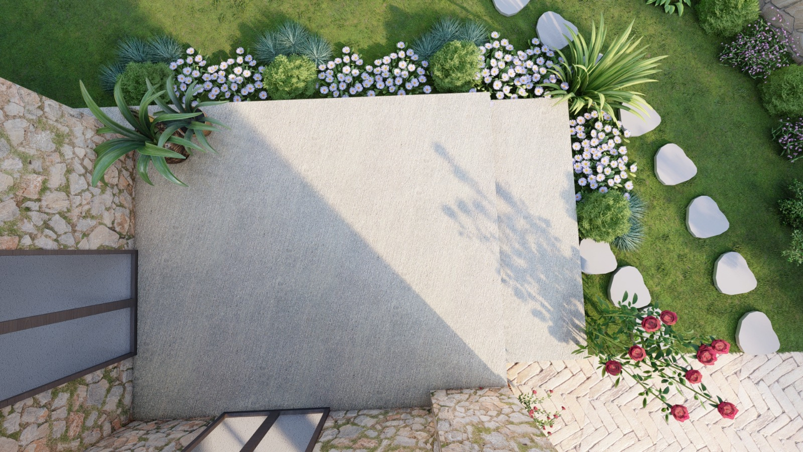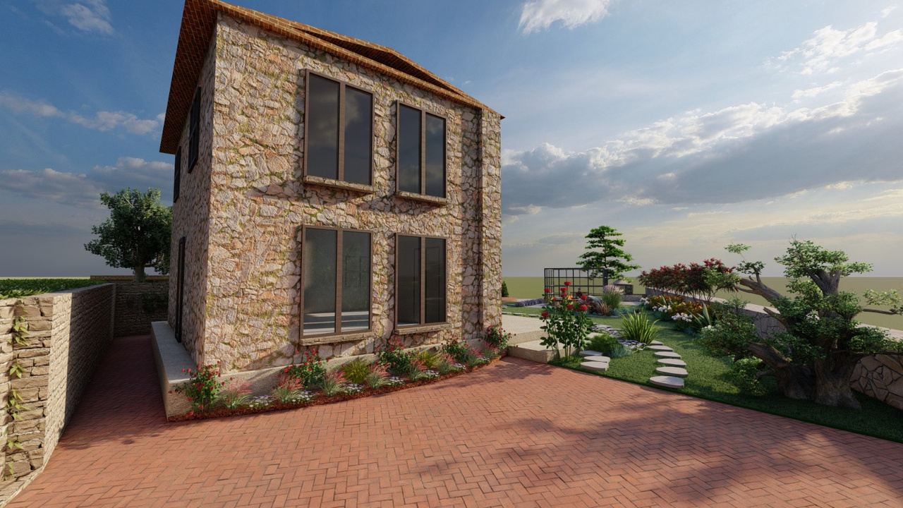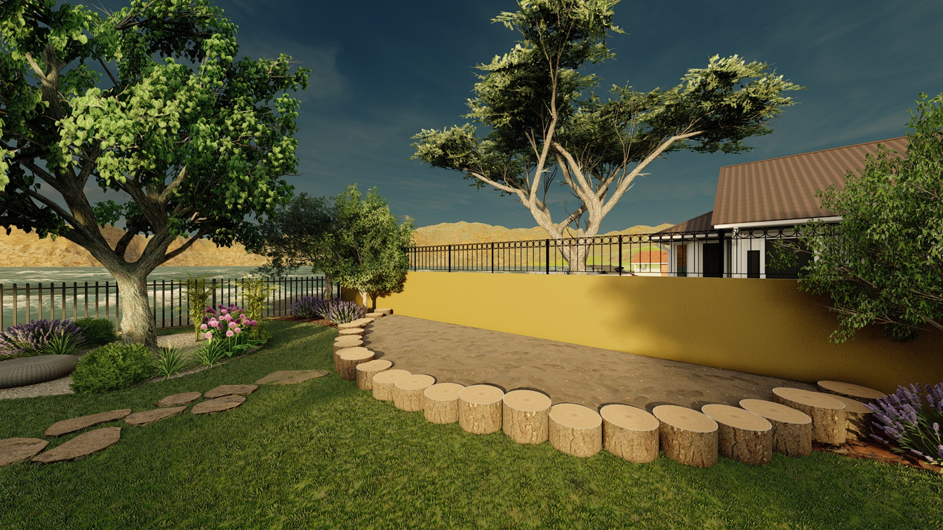 Kompakt formlu bitkiler ile desteklendirilerek keyifli bir ortam tasarlanmıştır. Bahçe gezinti yolu için doğal formlu kayrak taşı kullanılmıştır. Veranda girişi gezinti yolu ile bağlanarak yaya yol aksı oluşturulmuştur.