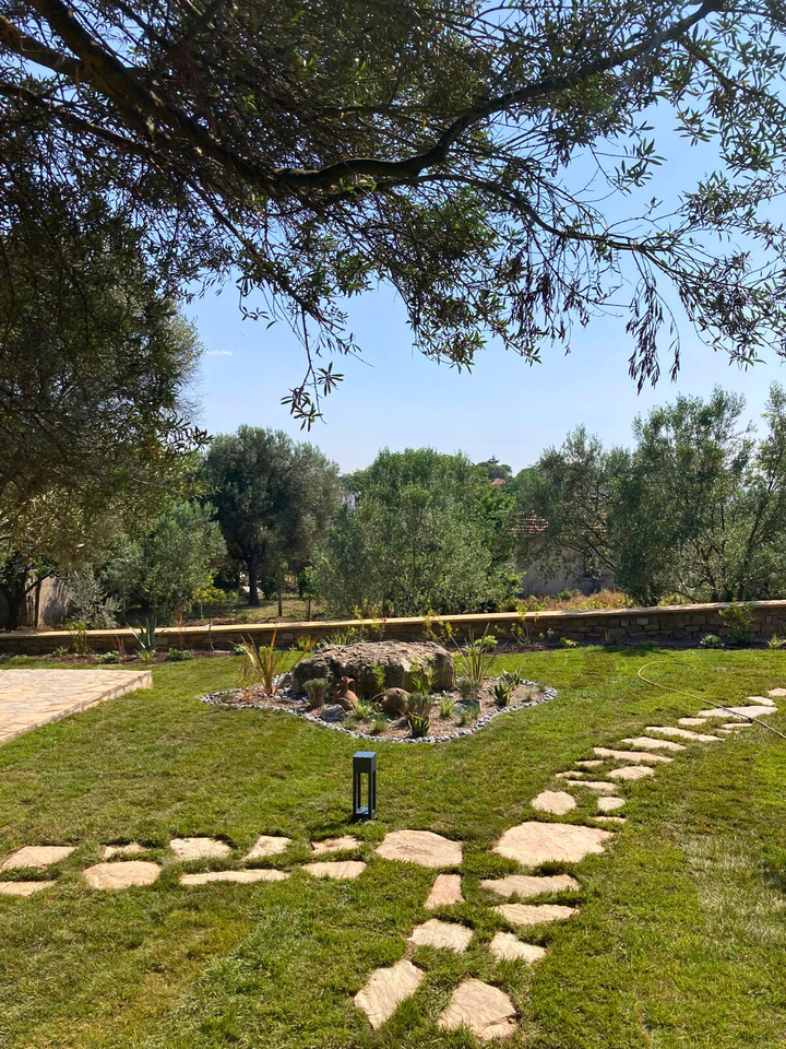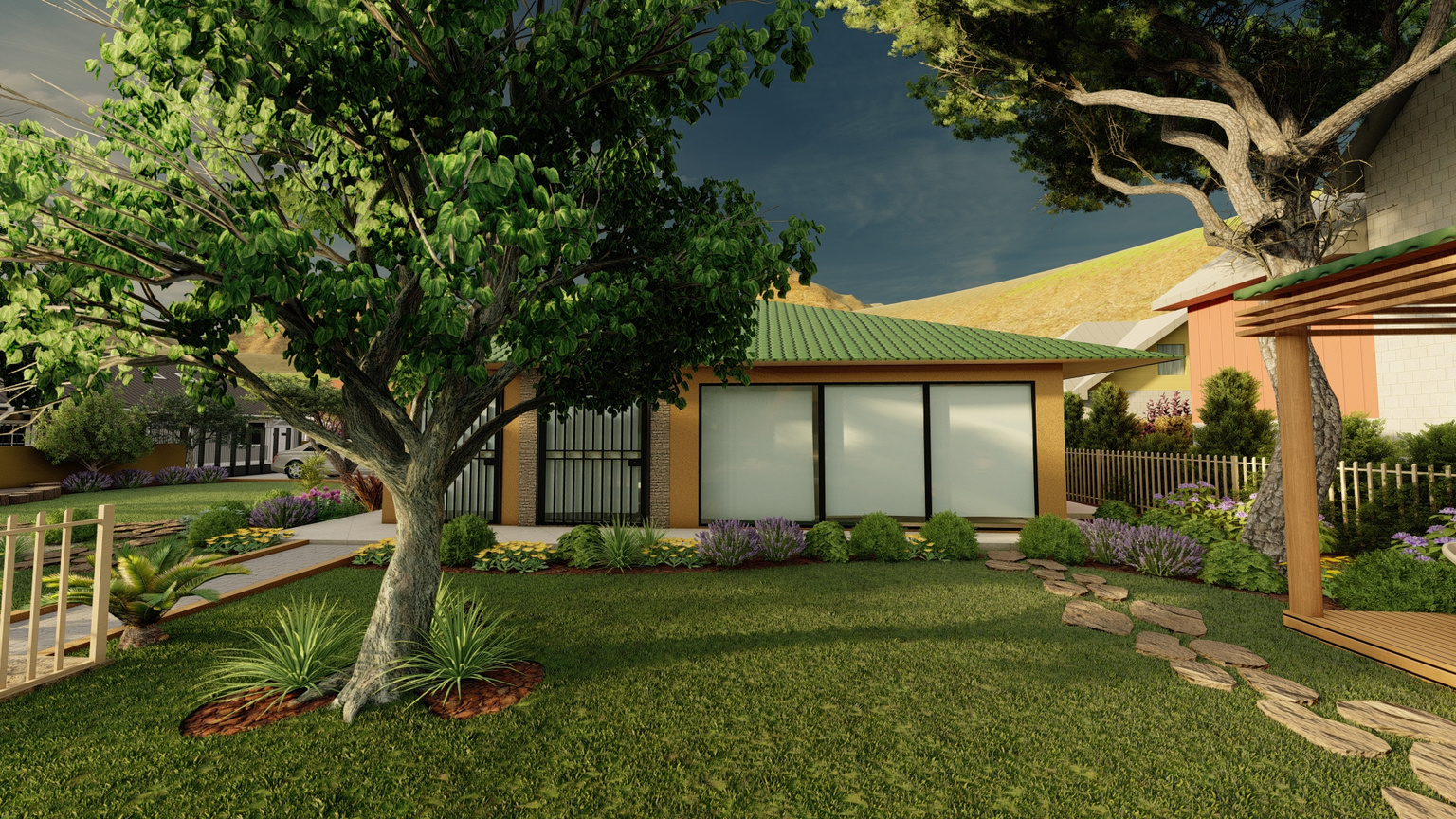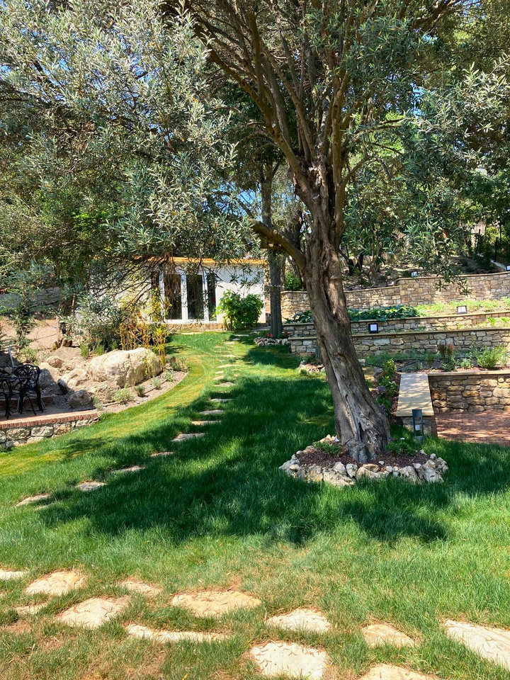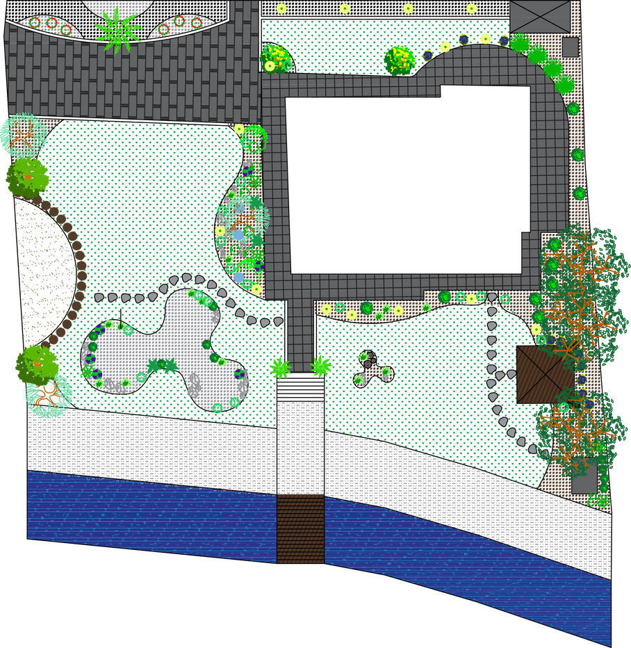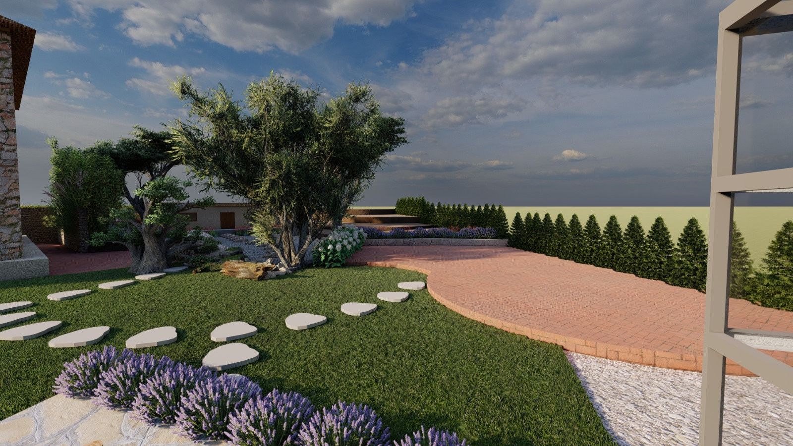 Kompakt formlu bitkiler ile desteklendirilerek keyifli bir ortam tasarlanmıştır. Bahçe gezinti yolu için doğal formlu kayrak taşı kullanılmıştır. Veranda girişi gezinti yolu ile bağlanarak yaya yol aksı oluşturulmuştur.