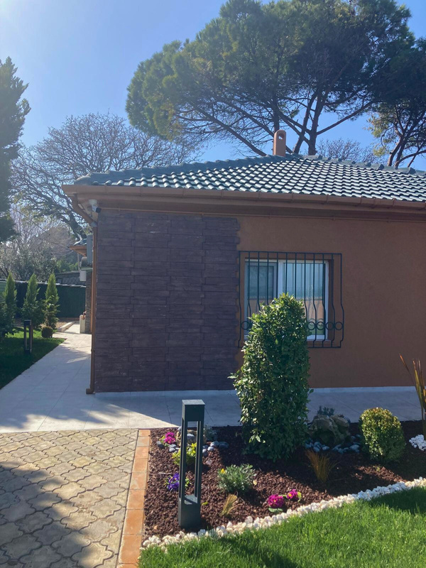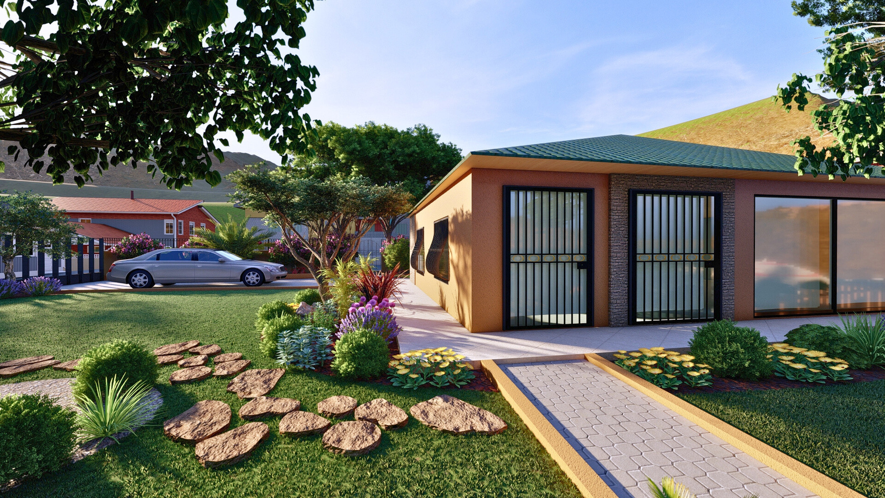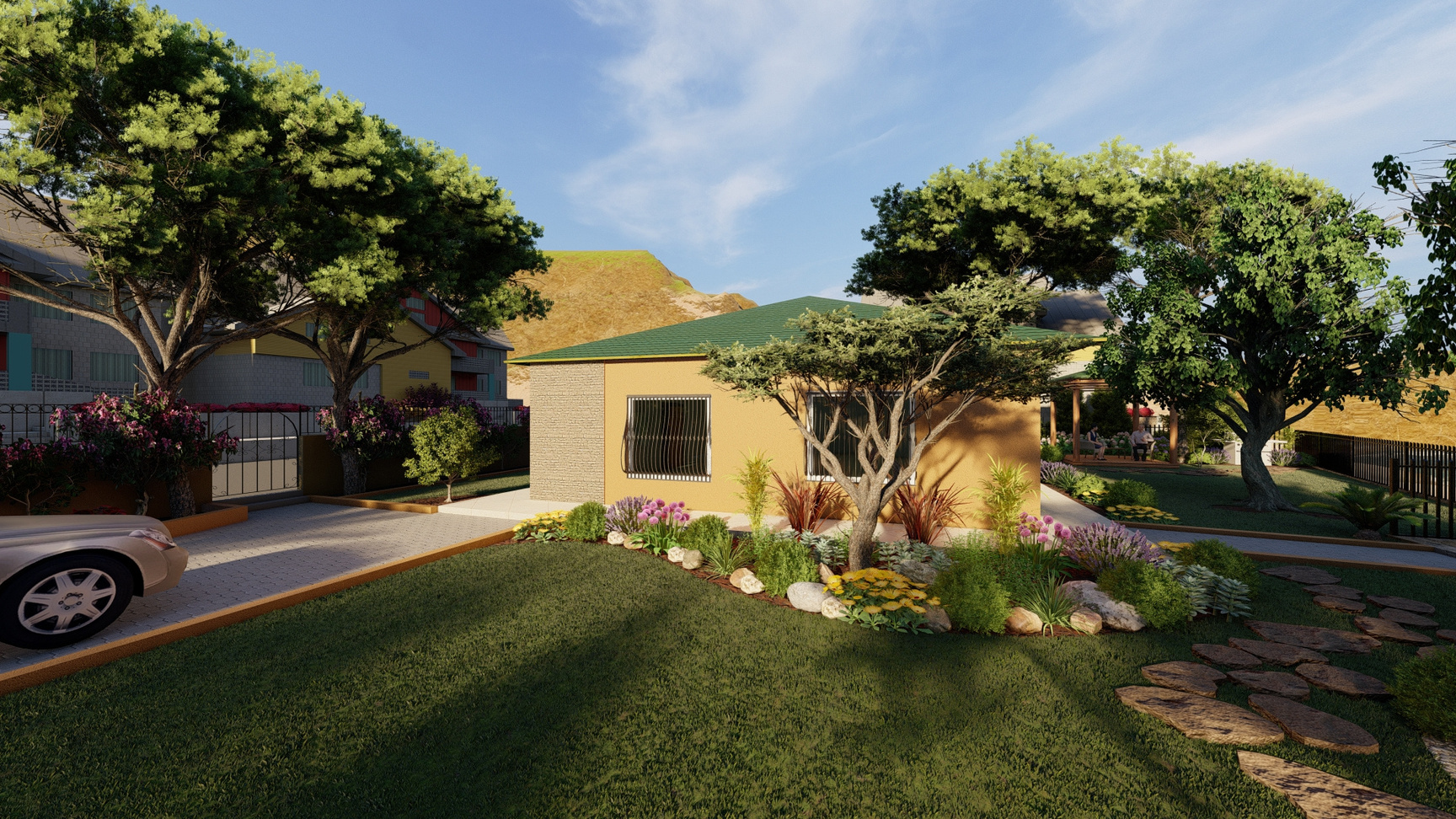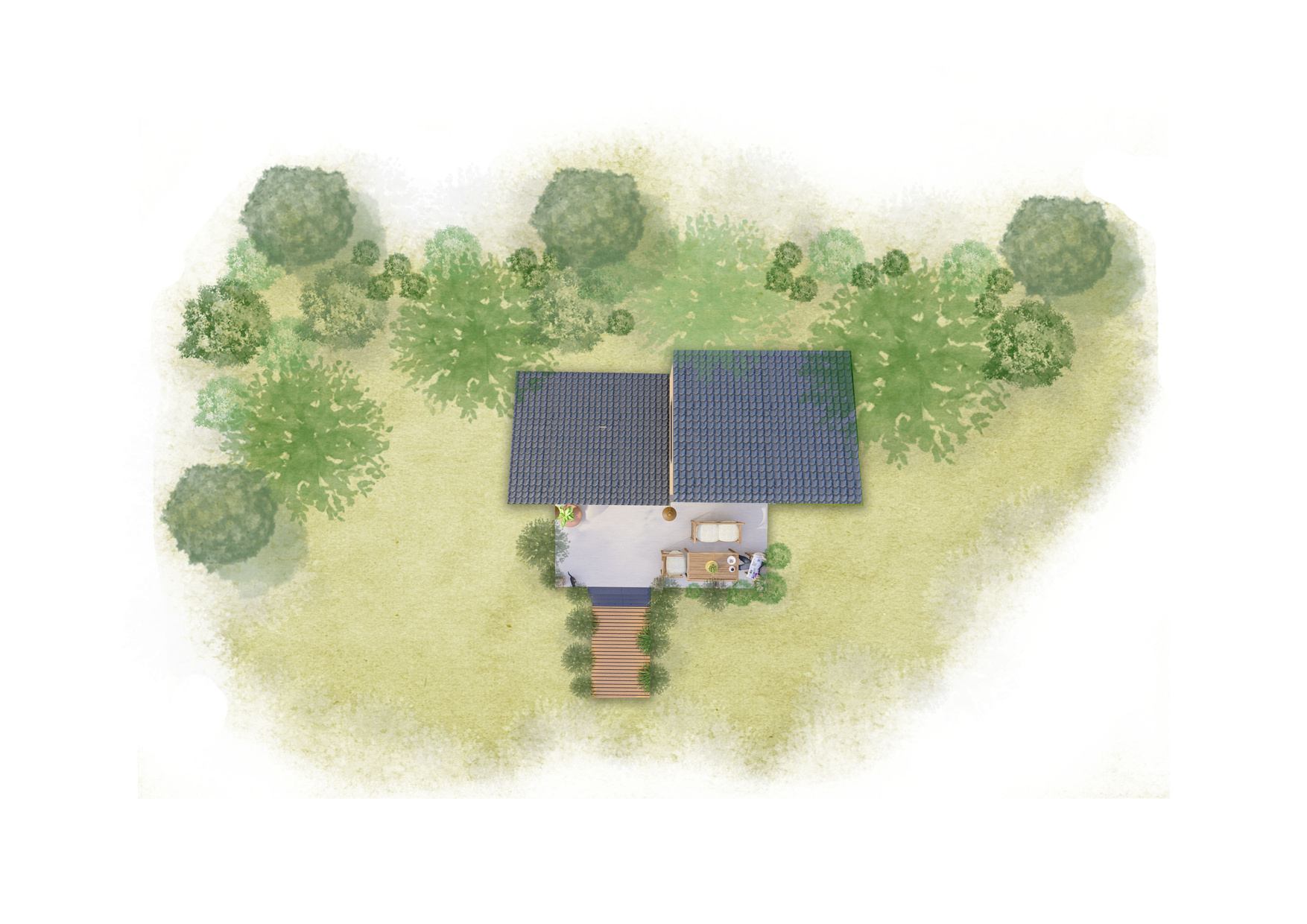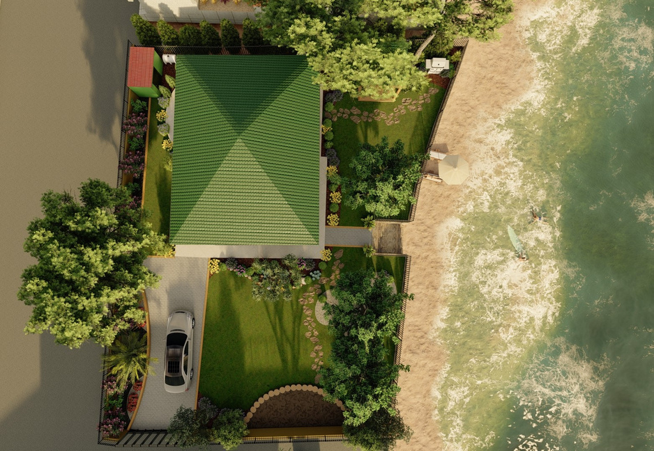 Kompakt formlu bitkiler ile desteklendirilerek keyifli bir ortam tasarlanmıştır. Bahçe gezinti yolu için doğal formlu kayrak taşı kullanılmıştır. Veranda girişi gezinti yolu ile bağlanarak yaya yol aksı oluşturulmuştur.