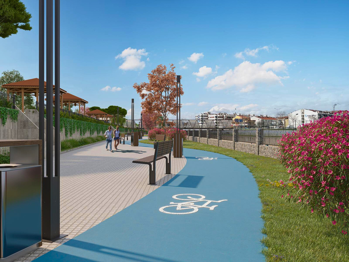 Bisiklet yolu, kullanıcıların güvenli ve rahat bir şekilde seyahat etmelerini sağlamak için ayrılmıştır. Bisiklet yolu kenarlarında yeşil alanlar ve bitkilendirme alanları oluşturularak estetik açıdan hoş bir görünüm sağlanmıştır.