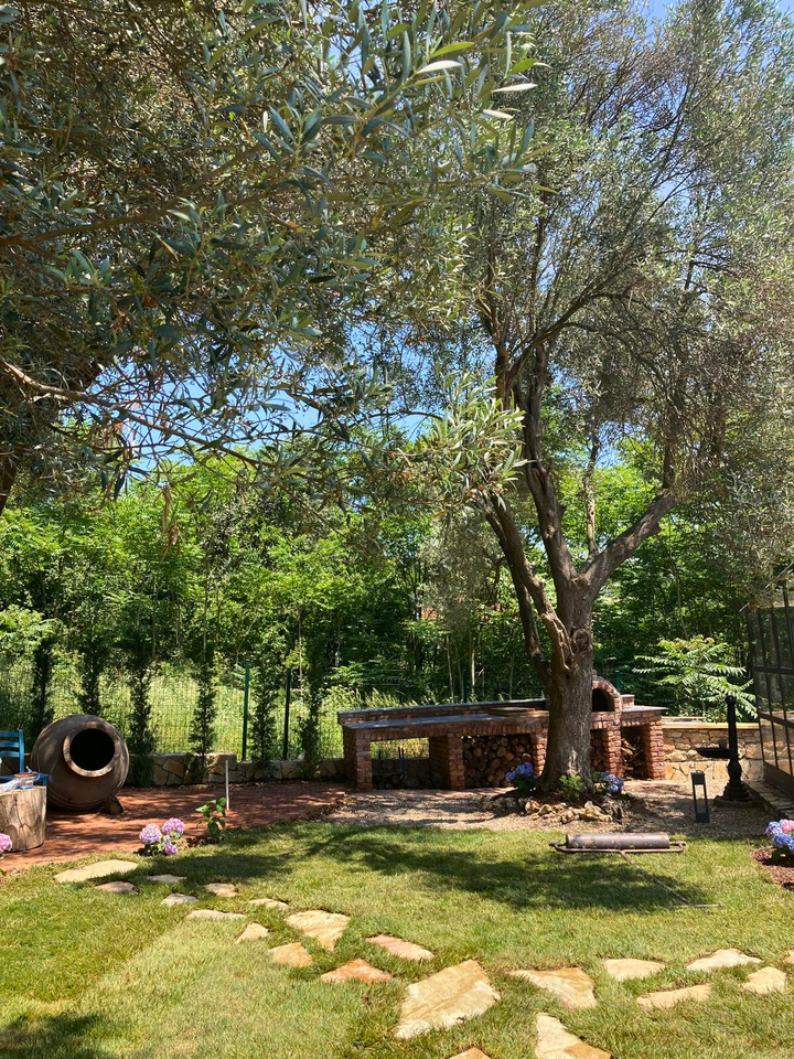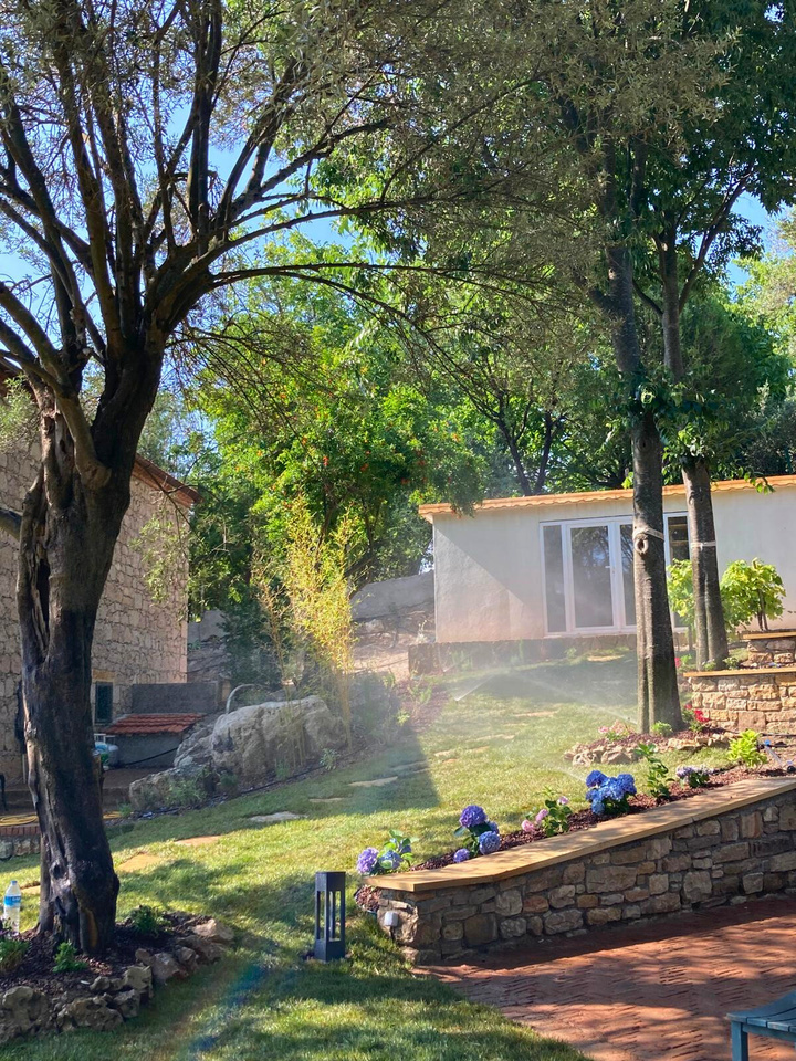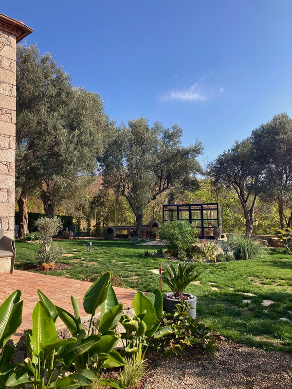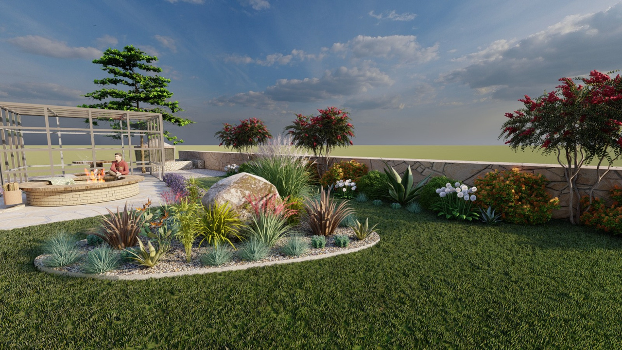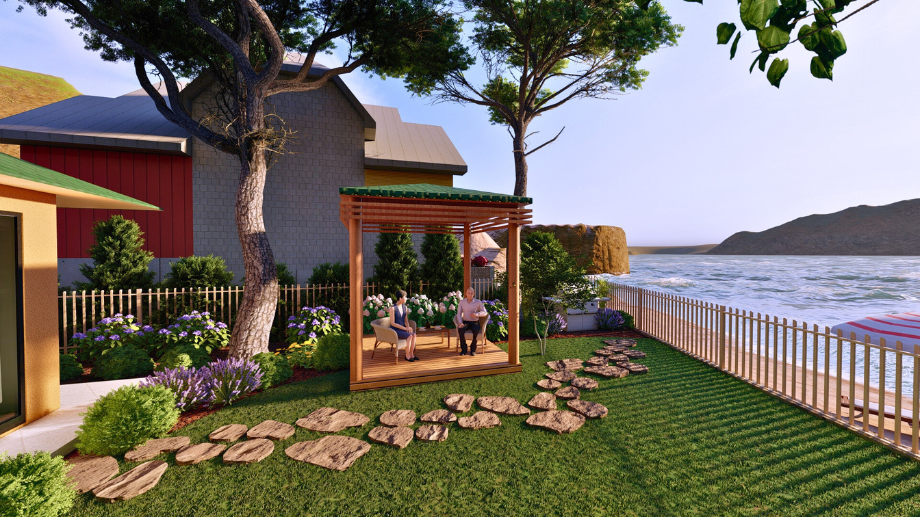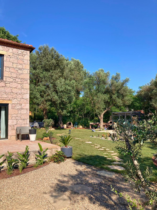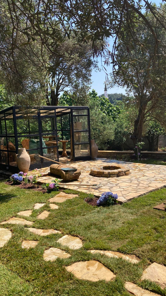 Çardakta geçirilecek zamanlar için eşsiz manzara yanında görsel etkisi yüksek bir bitkisel alan oluşturulmuştur. Alanda çim derzli kayrak taşı kullanılarak doğal ve estetik bir görüntü yanı sıra barbekü alanına bağlanarak işlevsellik kazandırılmıştır.