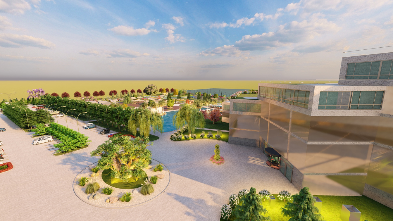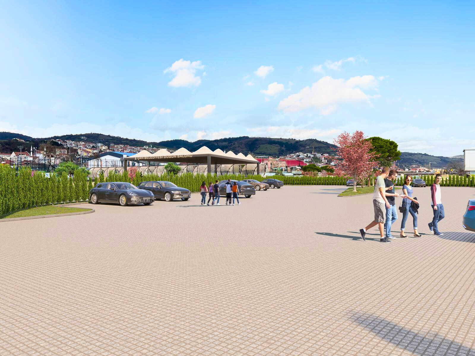 Otel girişi kısmında kullanıcıları geniş bir meydan karşılamaktadır. Araç ve yaya sirkülasyonu düzenli bir şekilde planlanmıştır. Ortada bitkisel bir alan oluşturularak hem estetik değeri yüksek bir alan sağlanmış hem de araçların ring yapması mümkün kılınmıştır. Otopark alanında geniş yapraklı ağaçlar kullanılarak gölgelik alanlar oluşturulmuştur.