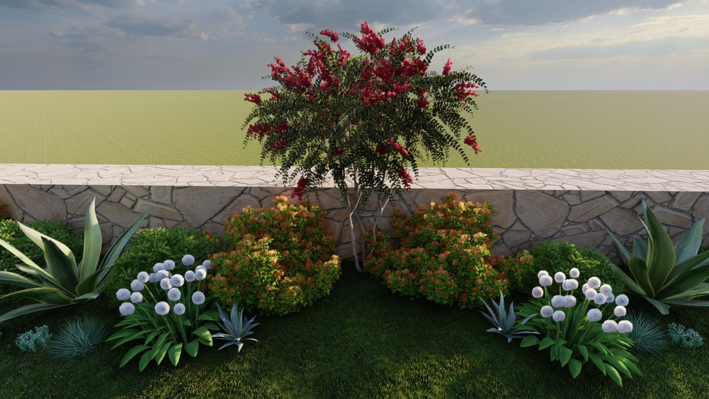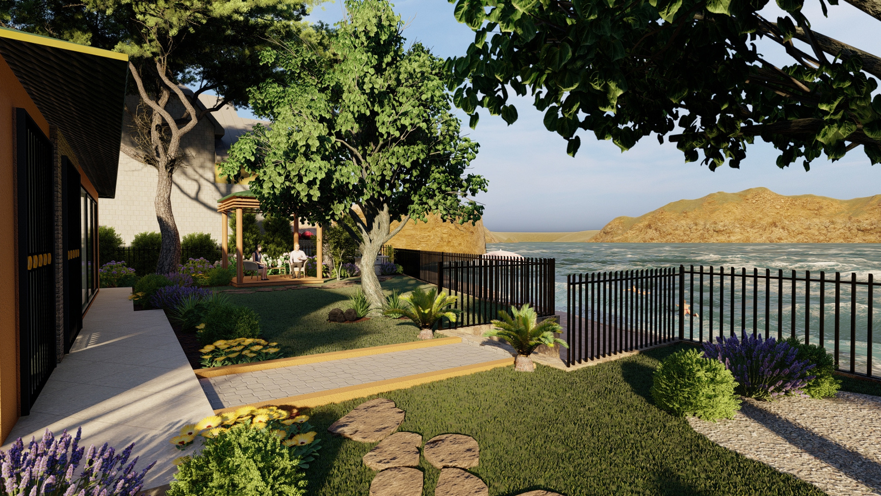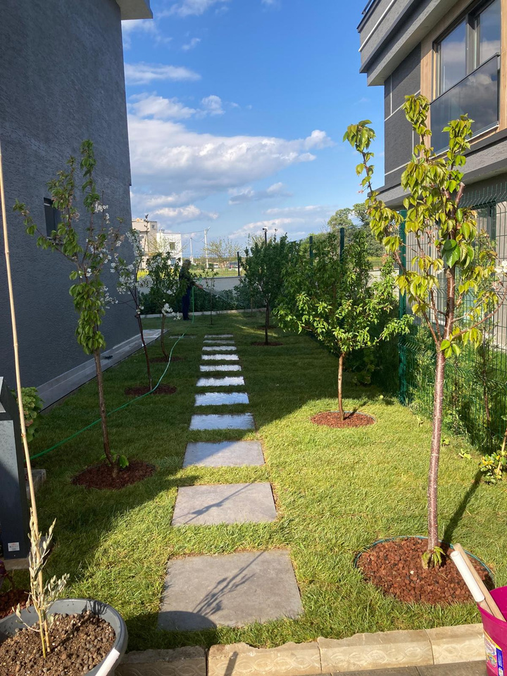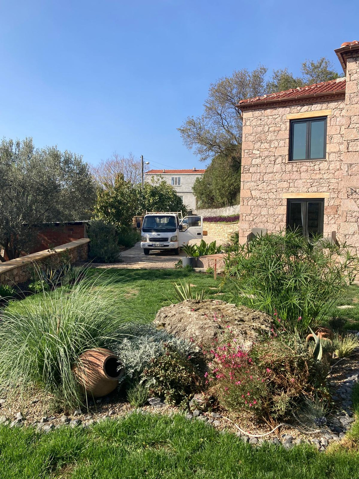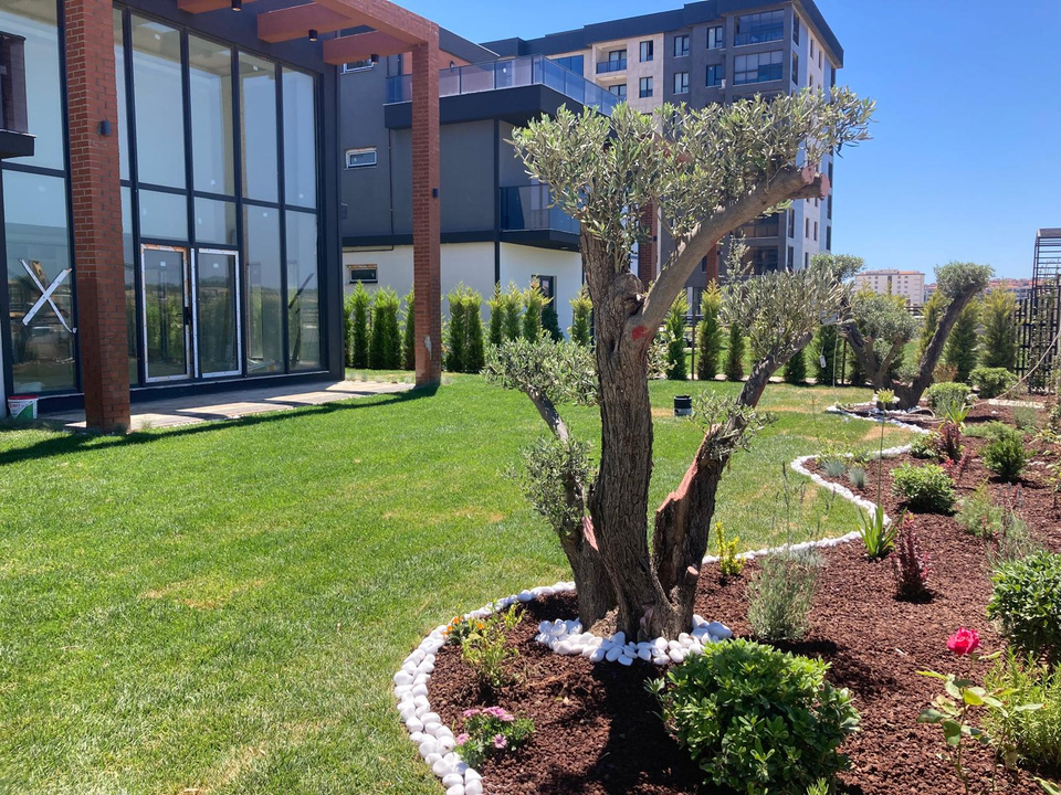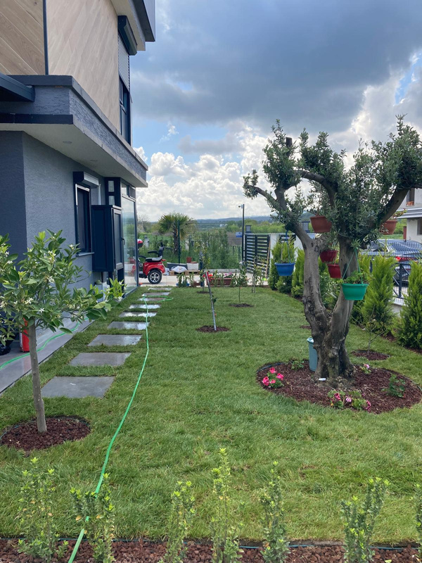 Bahçenin mevcut ağaçları korunarak bitkisel tasarım yapılmıştır. Veranda öndü manzarayı kesmeyecek şekilde kompakt ve estetik görünümlü bitkiler ile çevrelenerek görsel değer arttırılmıştır.
