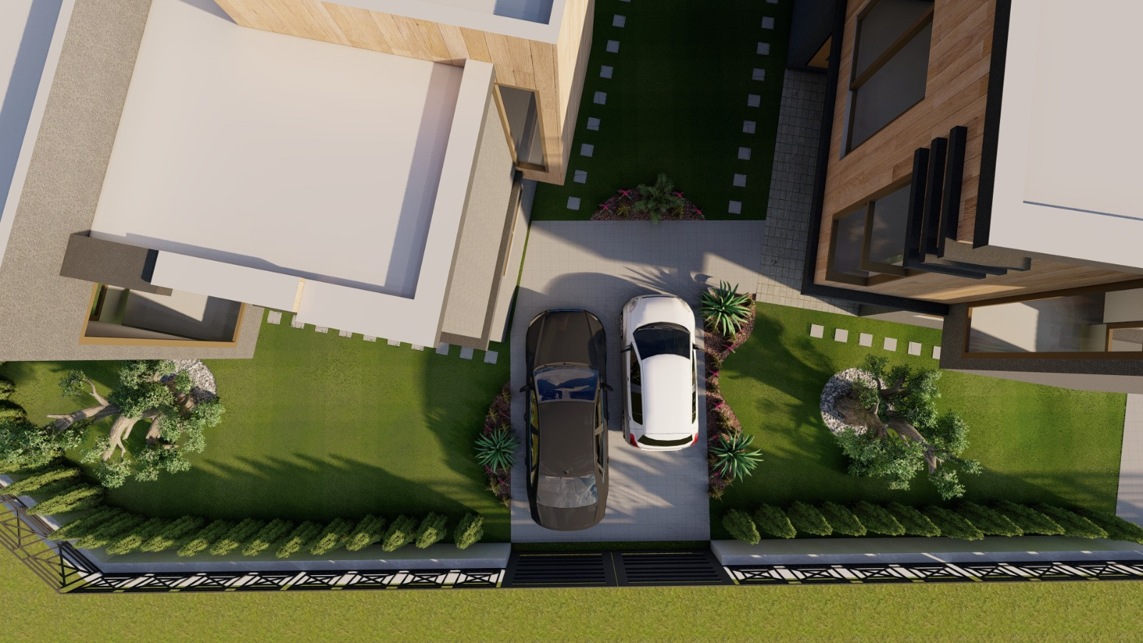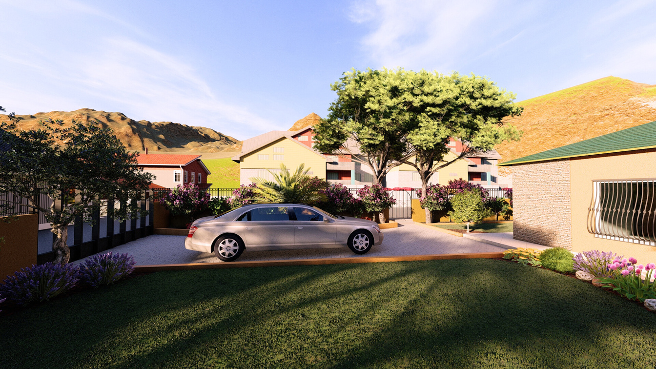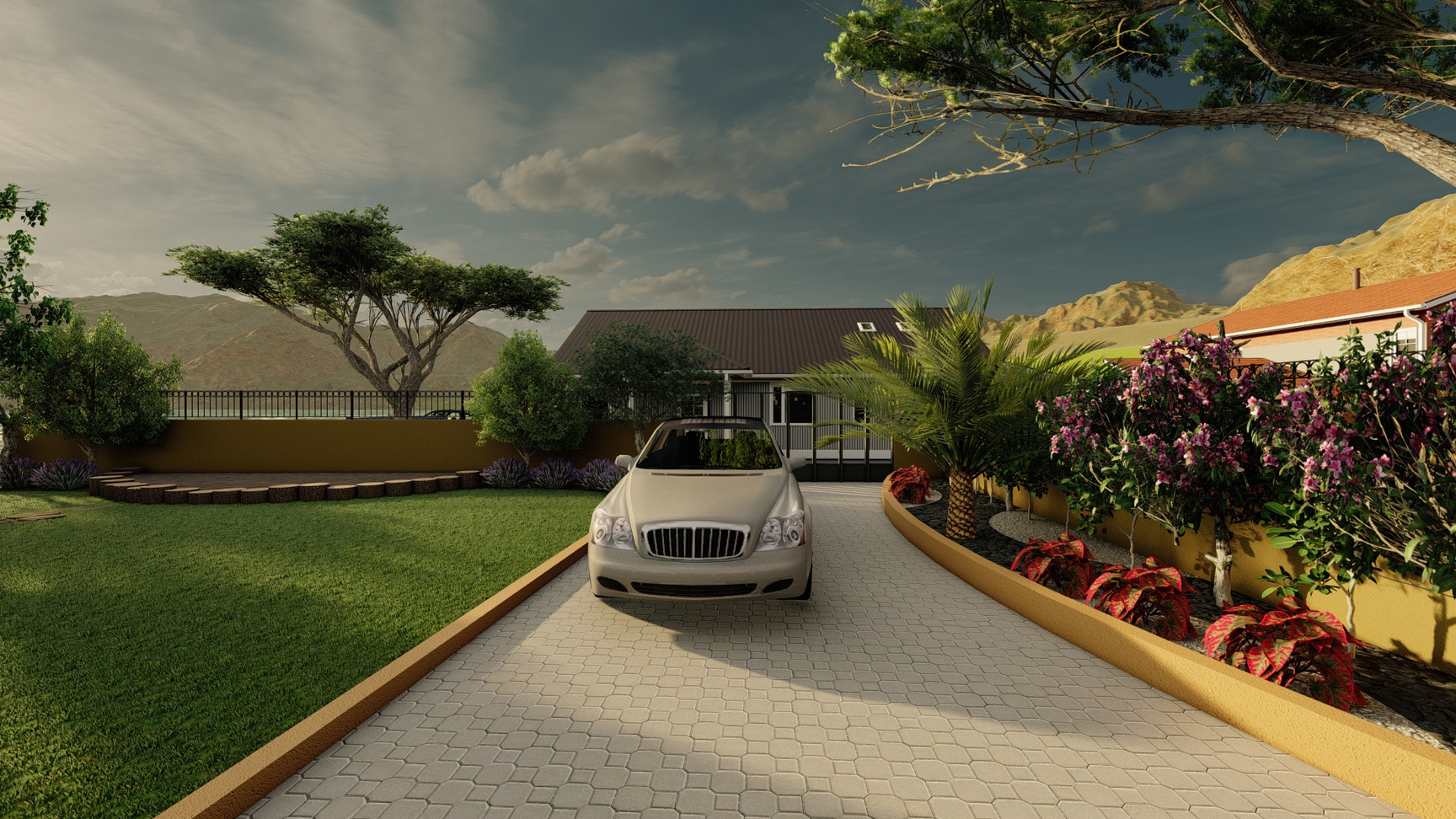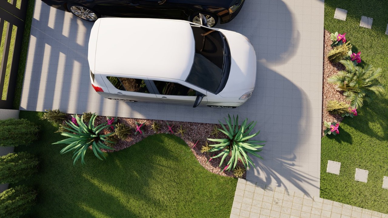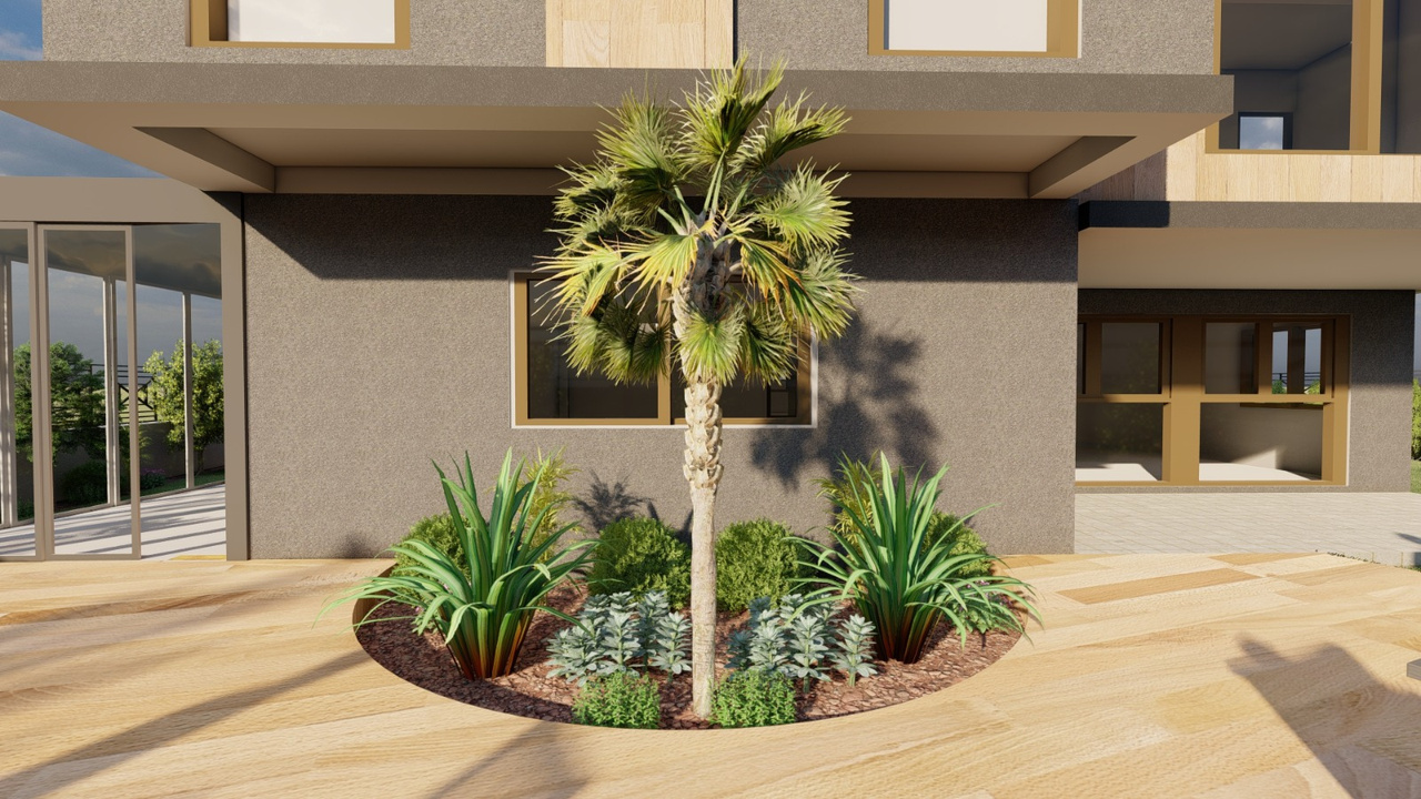 Bahçe girişi, daha rahat araç park edebilmek adına genişletilmiştir. Araç girişi bu noktadan sağlanmakta olup yaya girişi yan kapıdan sağlanmaktadır. Sol tarafta estetik değeri yüksek olan bodur hurma ağacı kullanılmıştır. Ve mevcut bitkiler korunarak nandina bitkisi ile görsel değer kuvvetlendirilmiştir.